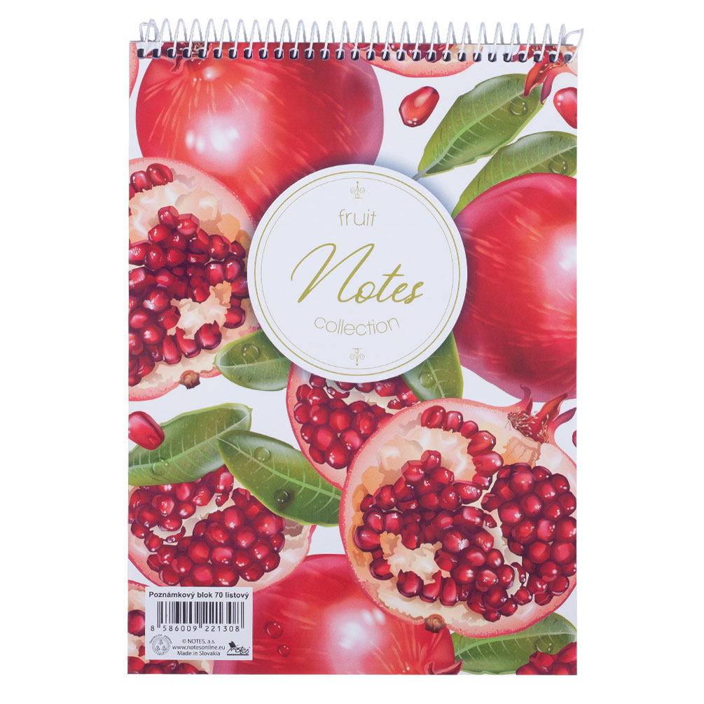 Poznámkový blok formátu A5 s hornou šprálovou väzbou, linajkový, 70-listový; s potlačou na prednej strane. Dodávané sú rôzne dizajny.