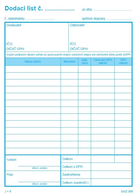 Tlačivo sa používa ako dodací list s DPH slúži ako daňový doklad. Obsahuje 100 listov, formát A5 - blok. Sfarbenie papiera biely, modré linky. Rozmery :20,5 x 21 cm - samoprepis.
