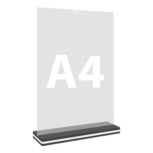 Reklamný stojan v tvare písmena T, obojstranný. Formát A4 / 210 x 297 mm. Vyrobené z tvrdého PVC. Na použitie pre letáky, katalógy alebo dokumenty. Ľahko sa čistí.