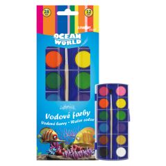 Veľké vodové farby, netoxické, 12 farieb s priemerom 2,8 cm, dodávané so štetcom v plastovom puzdre a v ochrannom papierovom obale.