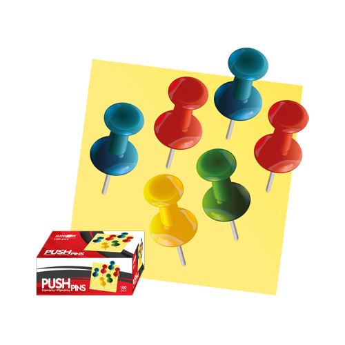 Pripínačiky nástenkové / Poniklované farebné pripináčky do korkových tabúľ s farebnou hlavičkou v tvare vežičky o priemere 7 mm a nožičkou dlhou 12 mm.
