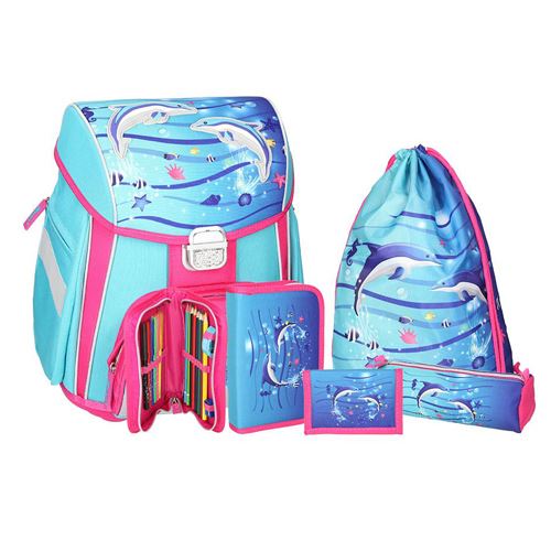 Školská taška - 5-dielny set, START Dolphins. Set obsahuje: školskú tašku, vrecko na prezúvky, 19-dielny peračník, puzdro na pera a peňaženku. • moderný dizajn s 3D potlačou, polyesterový materiál • kvalitná kovová spona s reflexnými prvkami • reflexné pásy, ktoré zvyšujú viditeľnosť a bezpečnosť v noci • anatomicky tvarovaný chrbát pre jednoduchú cirkuláciu vzduchu • dve bočné vrecká, predné vrecko s tepelnou izoláciou • predný a zadný nastaviteľný pás s plastovou sponou, plne lemované a pohodlné popruhy • rozvrh hodín a adresný štítok • silné a stabilné dno s nožičkami • hmotnosť 1,20 kg, objem 25 l