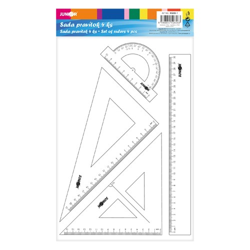 4-kusová rysovacia sada pravítok, vyrobená z transparentného plastu. Súčasťou súpravy je trojuholník s ryskou 17cm, pravouhlý trojuholník 24cm, pravítko 30cm/12inch, a uhlomer 10cm. Balené v plastovom puzdre.
