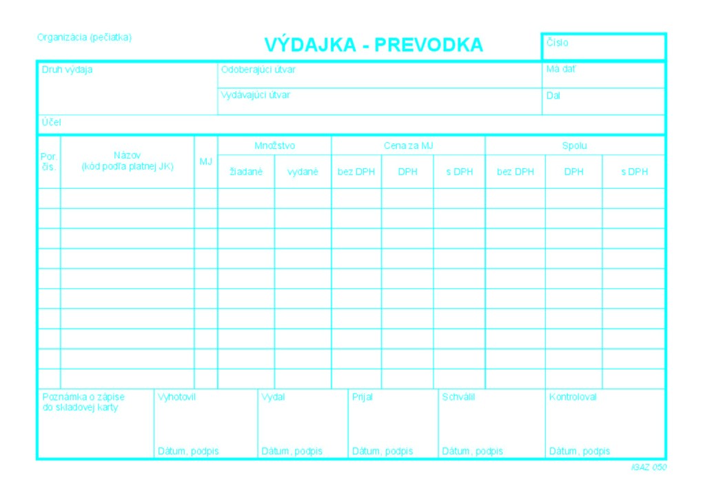 Tlačivo sa používa na výdaj a prevod tovaru s DPH. Obsahuje 100 listov. Sfarbenie papiera biely, modré linky. Formát A5 - blok.