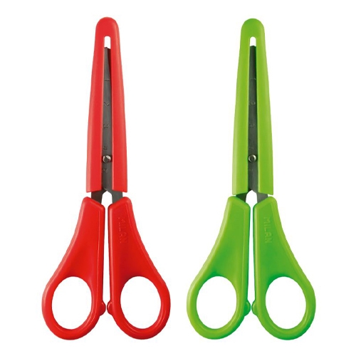Nožnice s puzdrom zodpovedajúcim rukoväti. Čepeľ z nehrdzavejúcej ocele so zaobleným hrotom a 5 cm pravítkom. Plastová rukoväť. Ideálne pre použitie v škole. Dostupné farby: žltá, modrá, červená a zelená. 14,7 cm.